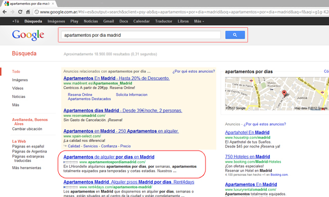 N°1 para la busqueda "apartamentos por dia madrid" para Apartamentos Madrid.